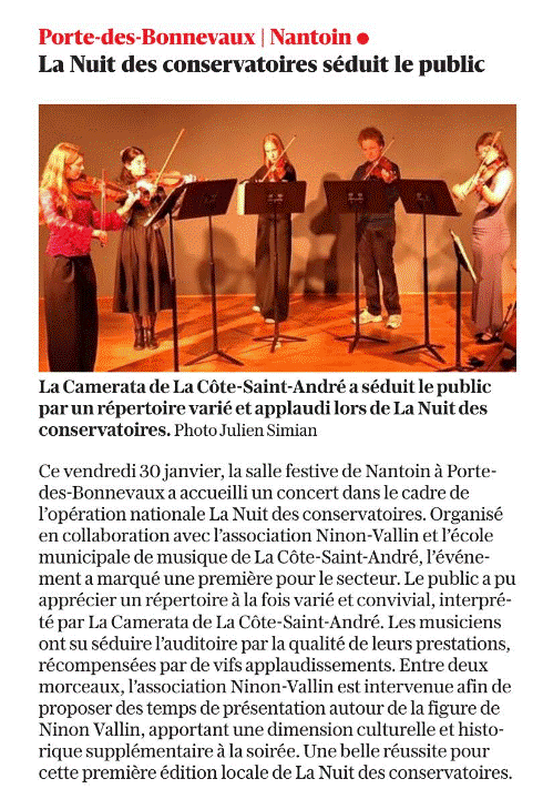 Après une introduction par son directeur, M. Jean-Paul Ravel, "LA CAMERERATA LCSA" phalange de l’Ensemble à cordes de l’École de Musique de La Côte-Saint-André, formée de violonistes, altistes et violoncellistes de niveau de 2ème et 3ème cycles, réussisait la gageure d'évoluer sans filet devant un public non conquis d'avance. De longs applaudissements enthousiastes et rappels, ont vu le sextet improviser sur la Danse hongroise de Brahms. Enfin, cette soirée originale alternait musique et interludes consacrés à Ninon Vallin, assurées par le président de notre association et conçues par les parentèles de Vallin : "Vallin la Transmetteuse", d’abord élève puis professeure de Conservatoires + "Ninon la Voyageuse" (dans la foulée du tango sud-américain). Cela offrait une soirée alerte et de découvertes. Une très belle collaboration unanimement appréciée des spectateurs, qui i ouvrait 2026, années des 140 ans de la naissance de Ninon Vallin, et appellera peut-être d'autres collaborations avec l'Ecole de musique, qui sait...